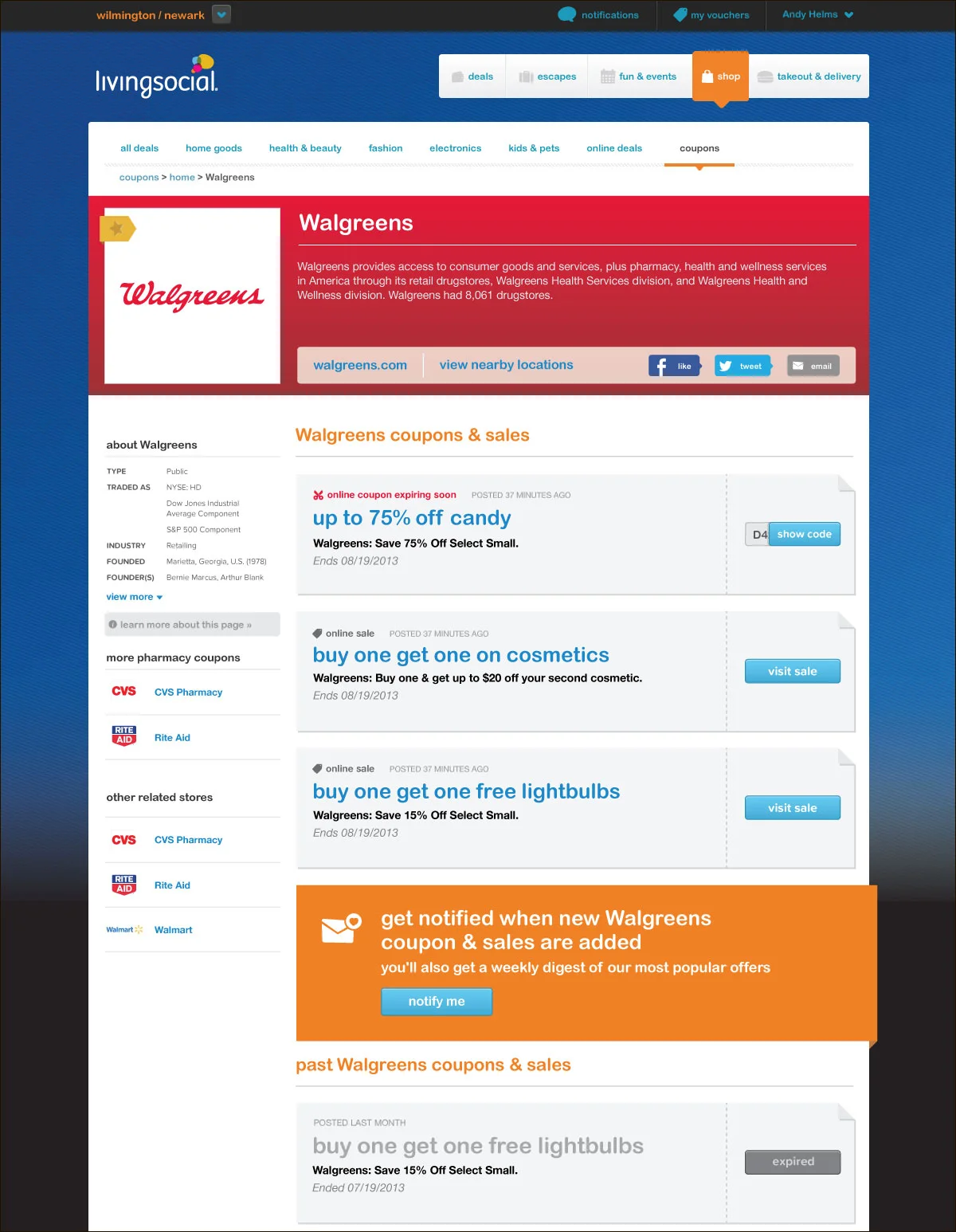 Launched in 2014, LivingSocial's Coupons includes more than 30,000 digital coupons and sales redeemable via mobile devices from more than 6,000 national brands. Acting as the UX design lead, our design decisions were informed by user interviews, sketching sessions, and iterative wireframes design cycles regularly tested with LivingSocial members. LivingSocial’s Coupons consistently delivers during nationwide retail promotions—on Black Friday we saw an email open rate 50% higher than average resulting in 25,000+ members spending more than 1.7MM with our partners.